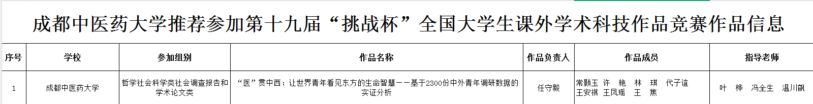 第十八届“挑战杯”四川省大学生课外学术科技作品竞赛终审决赛选拔出我校1项优秀作品,现推荐该作品参加第十九届“挑战杯”全国大学生课外学术科技作品竞赛详细信息下: