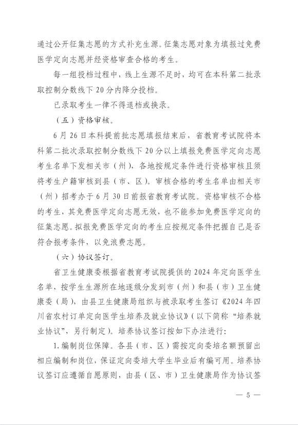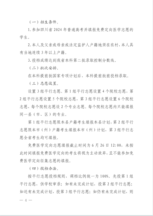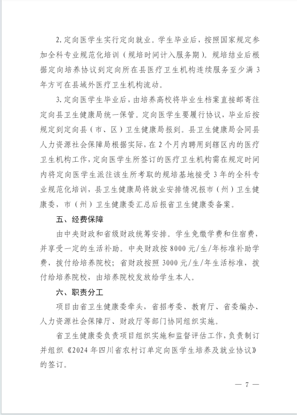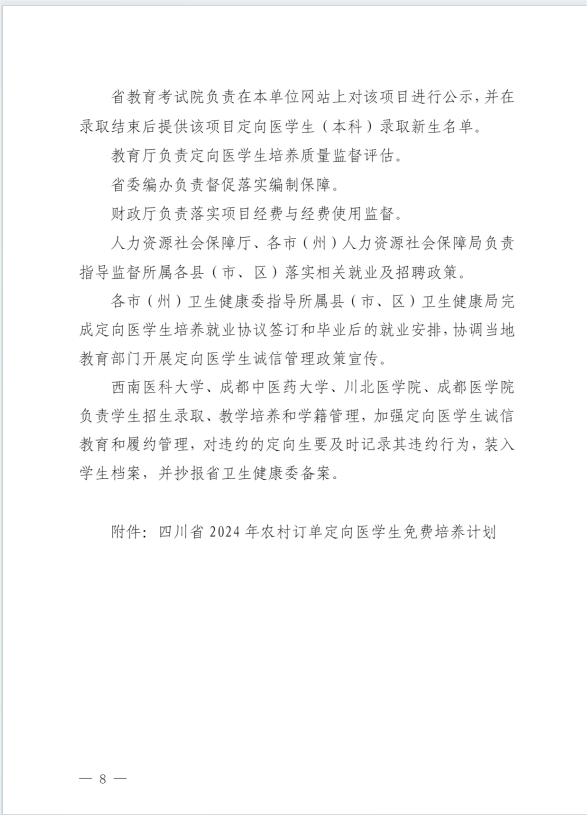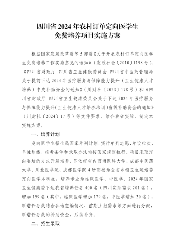 四川省2024年农村订单定向医学生免费培养项目实施方案