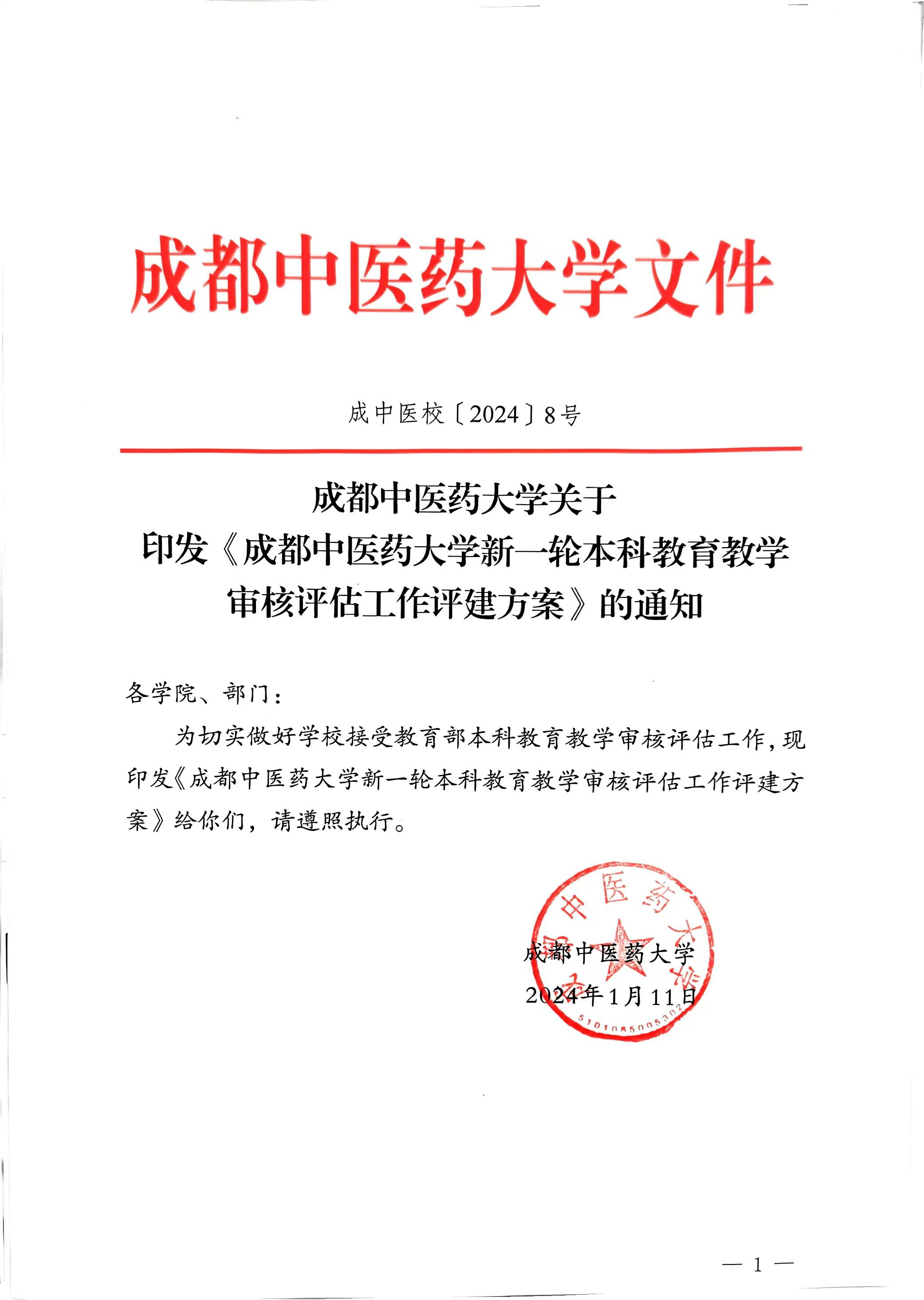 成都中医药大学关于印发《成都中医药大学新一轮本科教育教学审核评估工作评建方案》的通知 来源: 发布时间:2024-01-11 14:05:23 浏览次数: 次 【字体:小 大】 终审:教务处管理员 【打印正文】