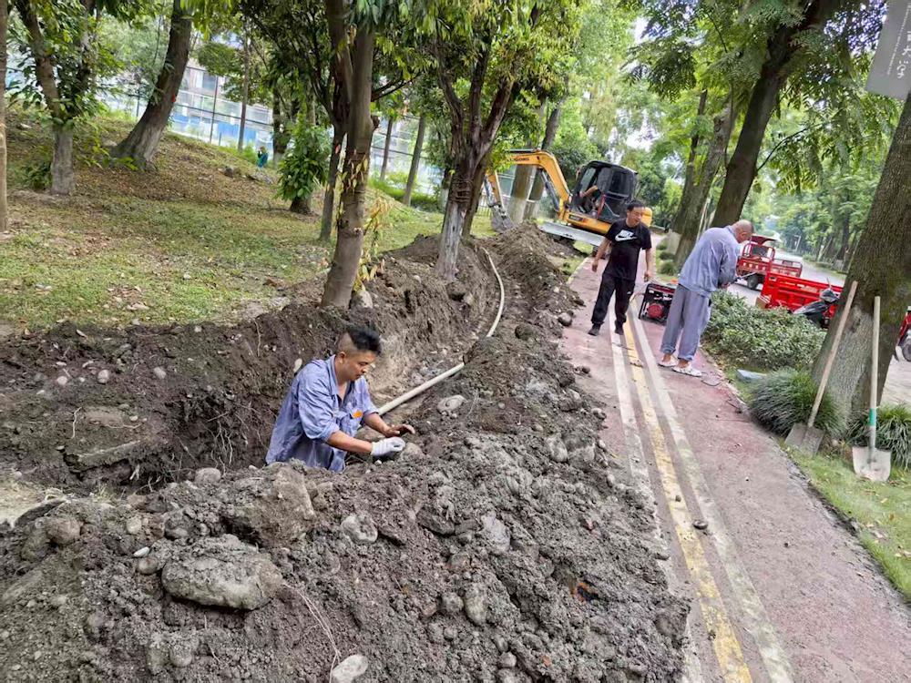 烈日下的绿化养护是一场不容松懈的“抗旱保卫战”。物业管理服务中心暑期推进药王山西侧及杏林鲜花地维护、绿化大棚搬迁、垃圾投放亭建设与鲜花补栽等项目,持续守护校园绿意。与此同时,十二桥校区后勤服务中心职工也坚守一线,全面开展除草修剪、补栽花卉及病虫害防治等精细化养护,以焕然一新的环境迎接新学期。