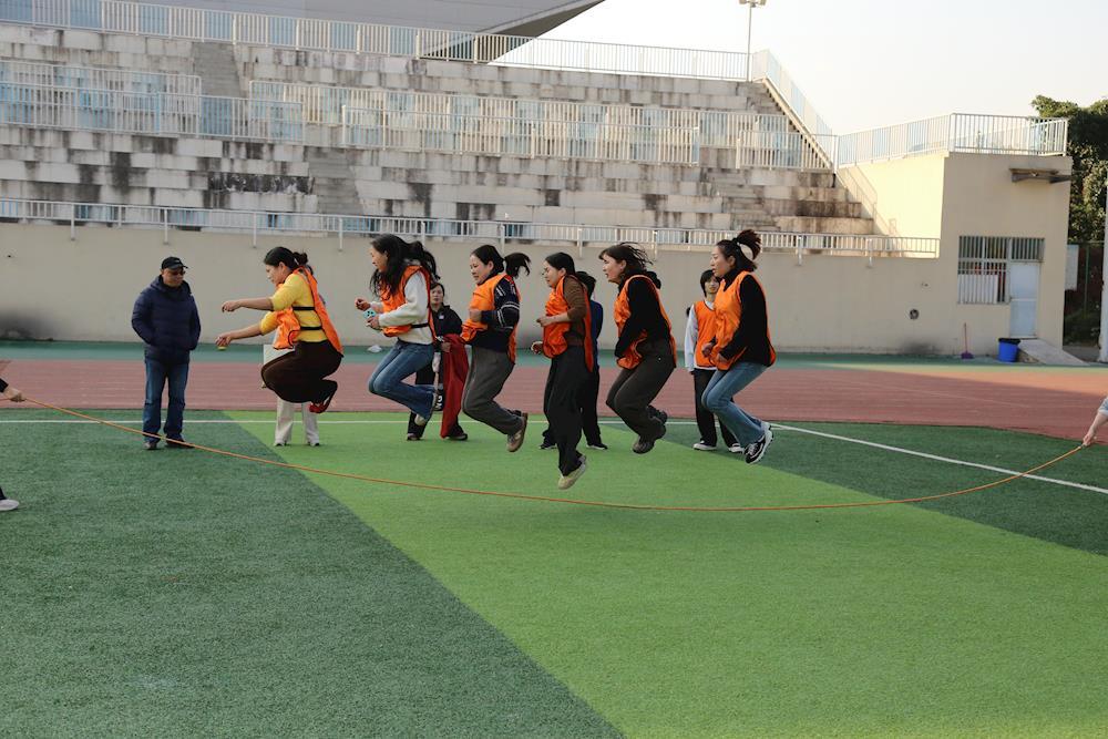 紧接着进行的趣味接力赛采取“闯关接力”形式,共设置跳长绳、手拉手穿呼啦圈、五人六足、企鹅漫步、吹乒乓球过河五项挑战。项目融合体能、技巧与协作,既考验个人能力,更强调团队配合。比赛中,各队根据项目特点灵活调配人员,遇到障碍时彼此鼓励、及时调整,展现出良好的应变能力和团队精神。
