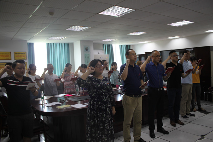 在《国际歌》的旋律中,在鲜红的党旗下,全体党员佩戴党徽,举起右拳,庄严宣誓。通过重温入党誓词,党员在党旗下再次接受心灵的净化和洗礼,牢记初心和使命,决心以更加饱满的热情投身工作,切实发挥共产党员的先锋模范作用。