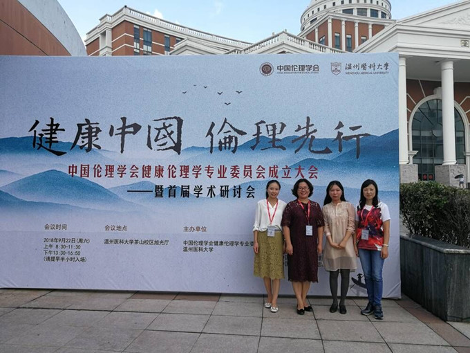 2018年9月22日,中国伦理学会健康伦理学专业委员会在温州医科大学成立,并举行首届学术研讨会,我院刘东梅院长、唐雪梅、雷虹艳及葛贤老师一行参加了会议。中国伦理学会会长万俊人出席成立大会并致辞,中国伦理学会常务副会长孙春晨主持选举工作。来自北京协和医学院、复旦大学、中国医科大学等高校和《中国结合医学杂志》《道德与文明》等科研学术机构的250余位专家学者及学校相关学院、附属医院的教师、医生、学生参加此次会议。