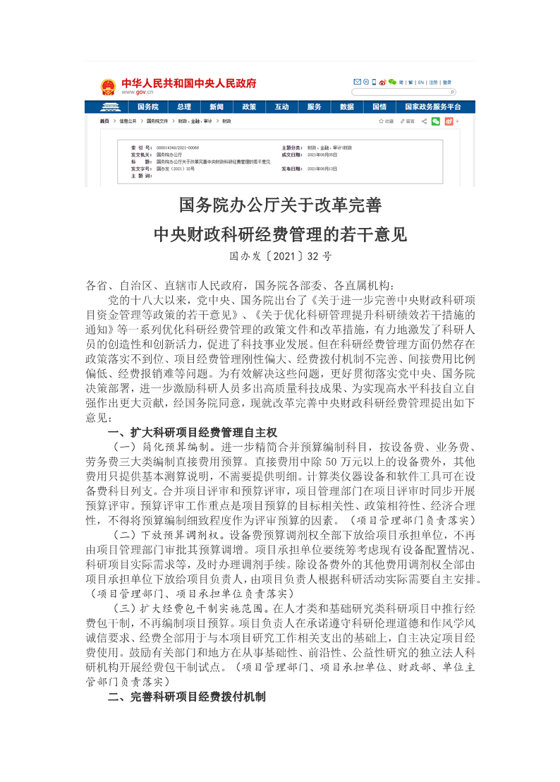 国办发〔2021〕32号 国务院办公厅关于改革完善中央财政科研经费管理的若干意见 来源: 发布时间:2021-10-15 10:28:22 浏览次数: 次 【字体:小 大】 http://www.gov.cn/zhengce/content/2021-08/13/content_5631102.htm 【打印正文】