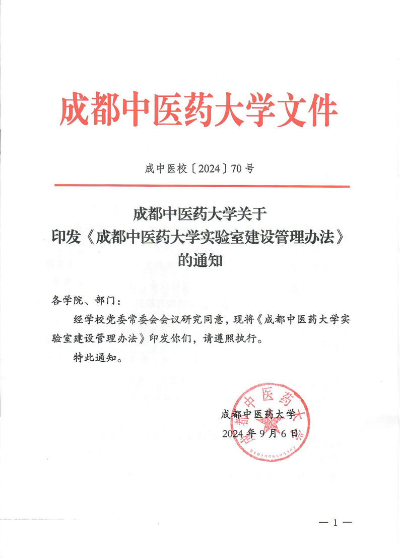 成都中医药大学关于印发《成都中医药大学实验室建设管理办法》的通知(成中医校〔2024〕70号) 来源: 发布时间:2024-09-29 15:38:59 浏览次数: 次 【字体:小 大】 终审:资实处管理员 【打印正文】
