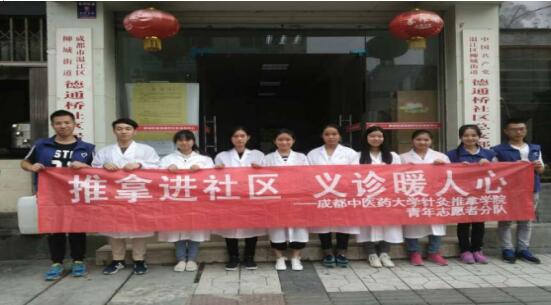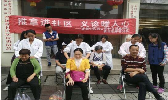 2016年9月25日,针灸推拿学院/第三附属医院分团委学生会青年志愿者协会在德通桥、梓潼、学府三个社区举办了本学期首次“推拿进社区,义诊暖人心”活动,此次活动在我院志愿者与社区居民的共同努力下取得圆满成功。