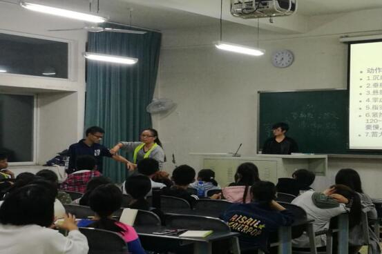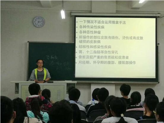 19:00活动正式开始。本次培训活动主要分为老师理论讲解和学生亲身体验两个部分。首先,老师们做了简短的自我介绍,获得了热烈的掌声,得到了同学们的支持。在老师风趣幽默的讲解下,同学们明白了“推拿”的含义,懂得了怎样学好推拿。老师们在讲解了点法、压法和揉法等手法后,走下讲台亲自指导同学们的手法动作。同学们分成两人一组交流学习,并在老师的帮助下,渐渐规范了推拿手法的动作。