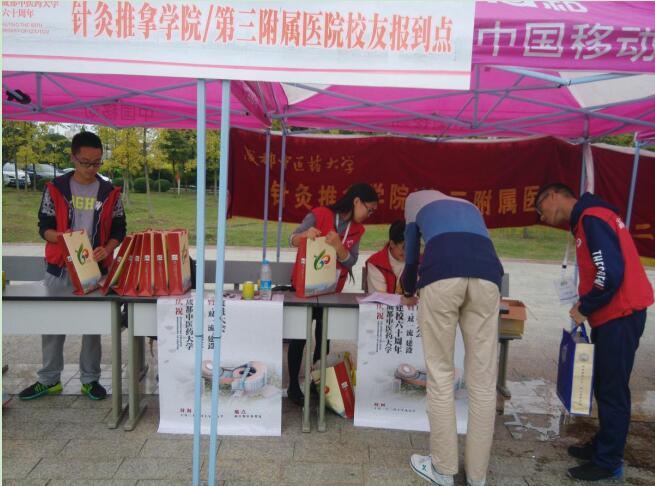 2016年10月23日上午9:00,成都中医药大学60周年校庆纪念大会校友接待工作正式开始,针灸推拿学院分团委学生会的老师及学生在百会堂旁边广场处,进行校友的接待与签到。此次活动主要由周海燕老师负责,同时由针推学院分团委学生会的干部干事共同完成接待工作。