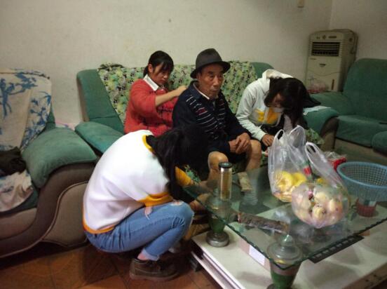 上午9:30,志愿者们从学校出发。为了表达心意,志愿者特地为老人买了一些水果与面包。10:00左右,志愿者到达老人家中。老人十分热情地欢迎志愿者们,并热切地与志愿者交谈。志愿者们分配好了任务,便开始行动。两人负责打扫卫生,另外三人为老人做艾灸和推拿。志愿者们完成任务之后,便与老人坐在一起聊天。老人表示很喜欢年轻的孩子们去家里陪伴他。