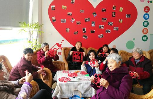 在与养老中心的负责人交谈之后,我们的活动于13:30正式开始。老人们围坐在大厅中享受午后时光,志愿者的到来为她们的生活增添了更多的乐趣。与老人们亲切交流之后,志愿者们拿出了事先准备好的红纸和剪纸模板,教老人们剪纸。虽然岁月使老人们的视力严重下降,但她们却很认真地用颤巍巍的手剪出了漂亮的图案,并且很开心地展示自己的作品,场面十分温馨。接着志愿者们为老人们演唱了两首歌曲:《茉莉花》、《当》,老人们十分捧场,演唱赢得了老人们的阵阵掌声,也得到了她们的热情回应。最后在与老人们合照后,志愿者与老人们依依惜别,15:30活动结束。