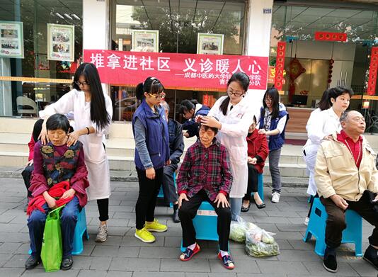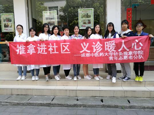 2017年4月23日,针灸推拿学院/第三附属医院分团委学生会青年志愿者协会“推拿进社区,义诊暖人心”志愿活动在德通桥、梓潼、学府社区开展。此次活动在志愿者和社区居民的参与下取得了圆满成功。