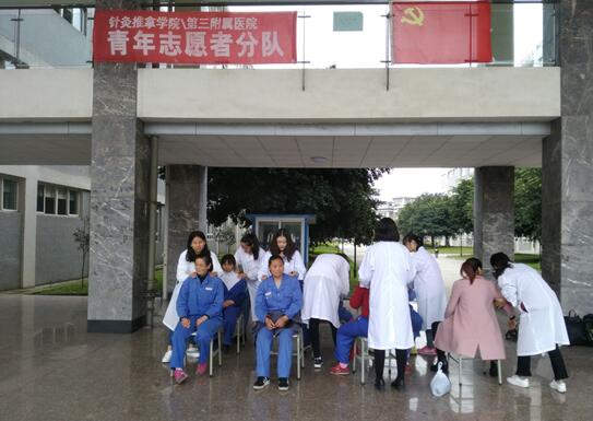 2017年4月27日,成都中医药大学针灸推拿学院/第三附属医院分团委学生会青年志愿者协会在温江校区DE教连廊举办了校园推拿活动。本次活动在大三志愿者和学校教职工的合作下取得圆满成功。