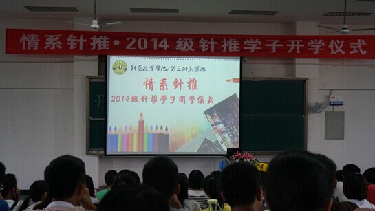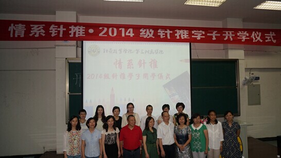 2014年9月11日下午18时,针灸推拿学院/第三附属医院成功召开了情系针推·2014级针推学子开学仪式。国际合作与交流处处长姚洪武,针灸推拿学院/第三附属医院院长李瑛,党委书记、副院长金荣疆,副院长张俭、曾芳,专家代表张虹教授、杨慎峭副教授等出席本次会议。教学科、研究生科和科研科、学生科、全体辅导员以及2014级全体新生参加本次开学仪式。仪式由院党委副书记杜娟主持。