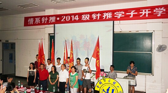 在校生和新生代表发言之后,姚洪武向2014级新生赠送院刊,学院/医院全体领导为2014级新生授班旗。新生代表们接过旗帜也标志着2014级新生接过针推学院传承的旗帜,在学院/医院领导老师的带领下,努力创造更加辉煌的明天!