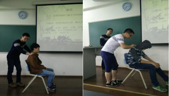 参与本次活动的是来自我院2012级吴棹仙班的娄灵睿、魏久斐、何文珊、陈俊伍四名志愿者,18:00培训正式开始。志愿者们讲课认真,尽最大可能的把自己所学知识教给参与培训的同学。他们精心准备了授课时所需要的PPT,在讲课的同时,还亲自给同学们示范动作;在讲课结束后,他们还耐心给同学们纠正动作,课堂氛围十分和谐。