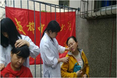 2015年4月26日,上午9:00左右,成都中医药大学针灸推拿学院青年志愿者协会组织同学进行“推拿进社区”活动。