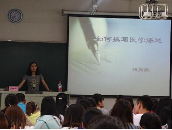 洪肖娟老师分别从医学综述的概念,作用,意义,形式,内容,注意事项等重要方面给学生们作了详细讲解,为同学构建了完整的医学综述书写思路。在教授医学综述书写格式的基础上,洪肖娟老师更加深入地为同学们讲解一篇好医学综述的写作要点。同学们在会上认真听讲,作笔记,并报以热烈的掌声。