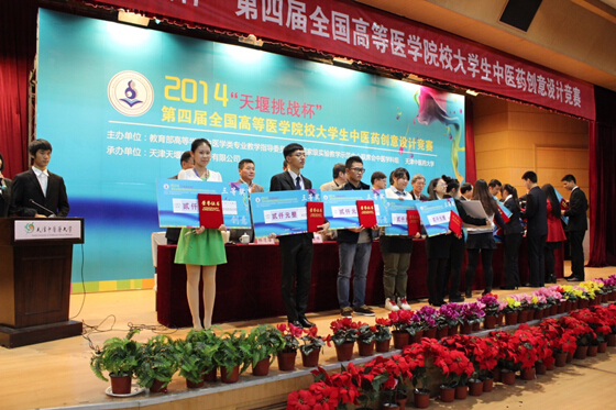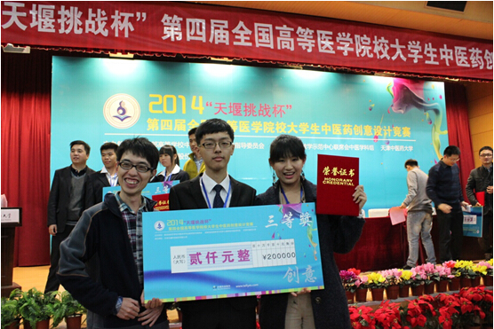 2014年10月31日-11月1日,由教育部高等学校中医学教学指导委员会、国家级实验教学示范中心联席会中医学科组、天津中医药大学共同主办的第四届“天堰挑战杯”全国高等医学院校大学生中医药创意设计竞赛决赛在天津中医药大学举行。经过激烈的角逐,我院2013级七年制中医学专业吴棹仙班学生文宇、刘昱的作品获得三等奖,其指导老师为我院张承舜讲师。