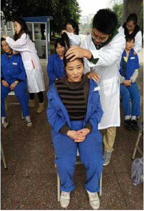 11:30随着我院青年志愿者协会干事的积极宣传和场地的布置,学校后勤工作人员开始投入到活动中。针灸推拿学院2013级吴棹仙班的9名志愿者保持饱满的热情,用娴熟的手法进行推拿。同时,志愿者还向学校后勤工作人员介绍了保护腰椎、颈椎等的方法,得到了他们的称赞。